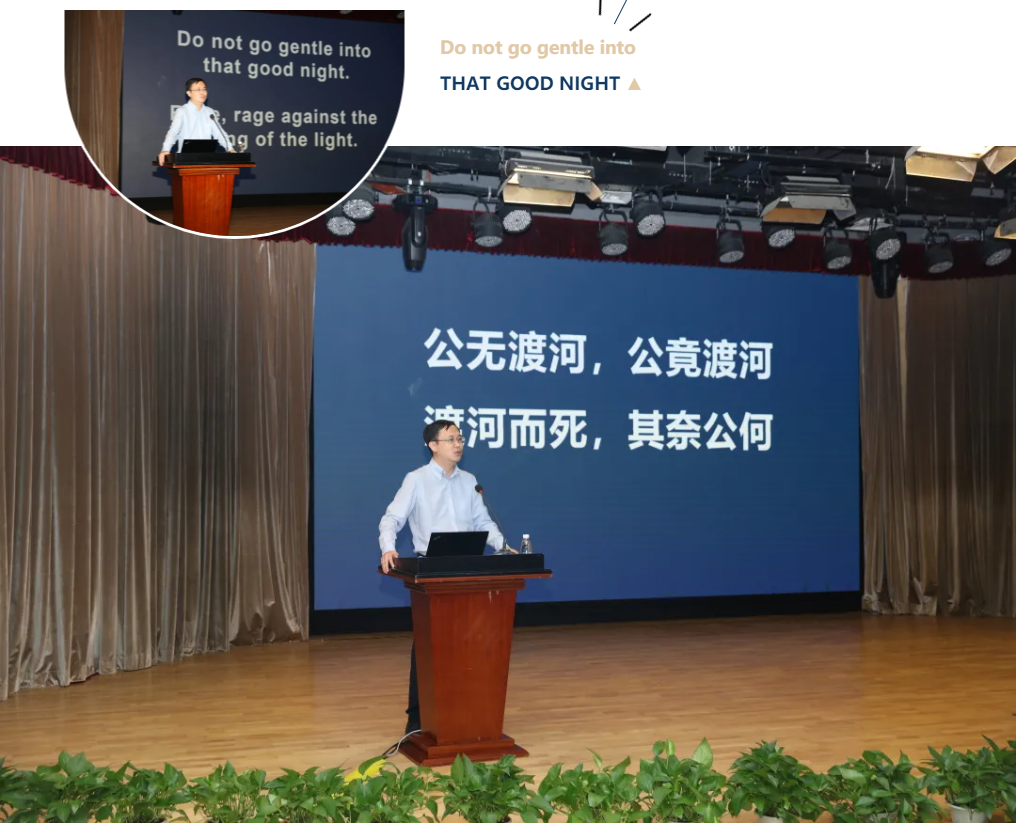 刘炜校长作为校方领导出席宣讲会,借用汉乐府《相和歌辞.箜篌引》一首古诗鼓励同学们要把热情变成行动,不要等年华老去才后悔逝去的青春;要勇于「渡河」,对逝去的时光要勇敢发出「怒吼」,勇敢「咆哮」;学校要做帮助学生渡河的「桥」,给学生点燃力量的「薪火」和施展潜力的「脚手架」,帮助学生们畅然实现理想。