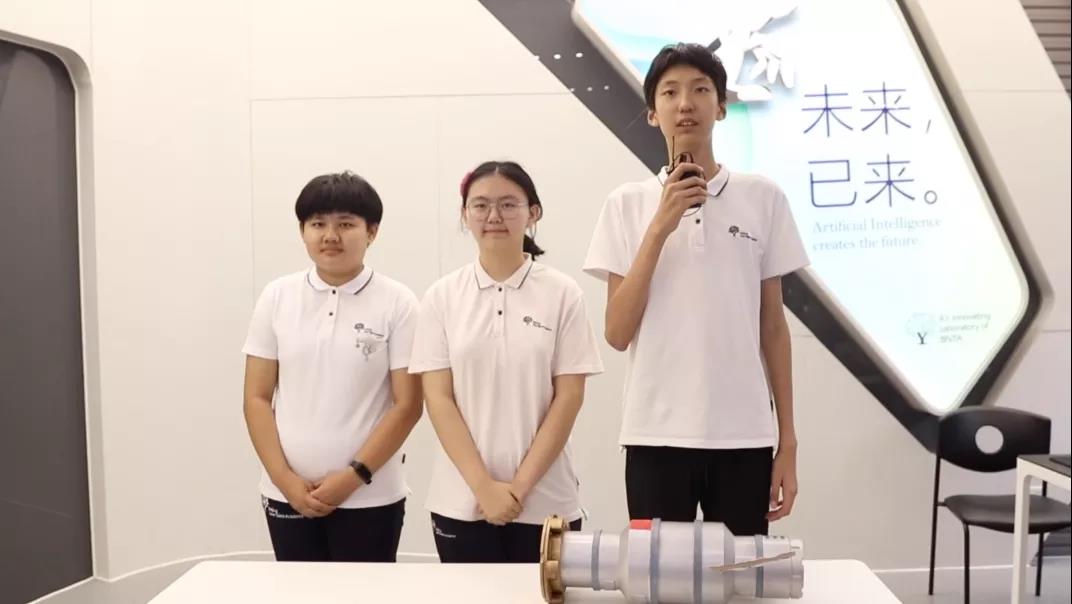 “我们的月球车可以安装了温湿度传感器,能够检测外部的环境温度并播报温度显示在驾驶员的操作平板上,还装有摄像头检测到实时画面。因为月球上没有光源,所以我们还在驾驶舱内安装了灯光照明装置,为驾驶员提供照明灯光,这就是我们的月球车。”